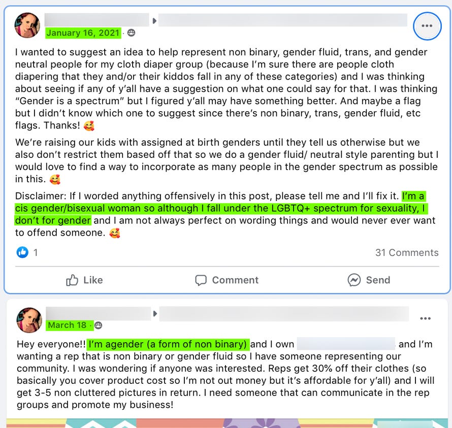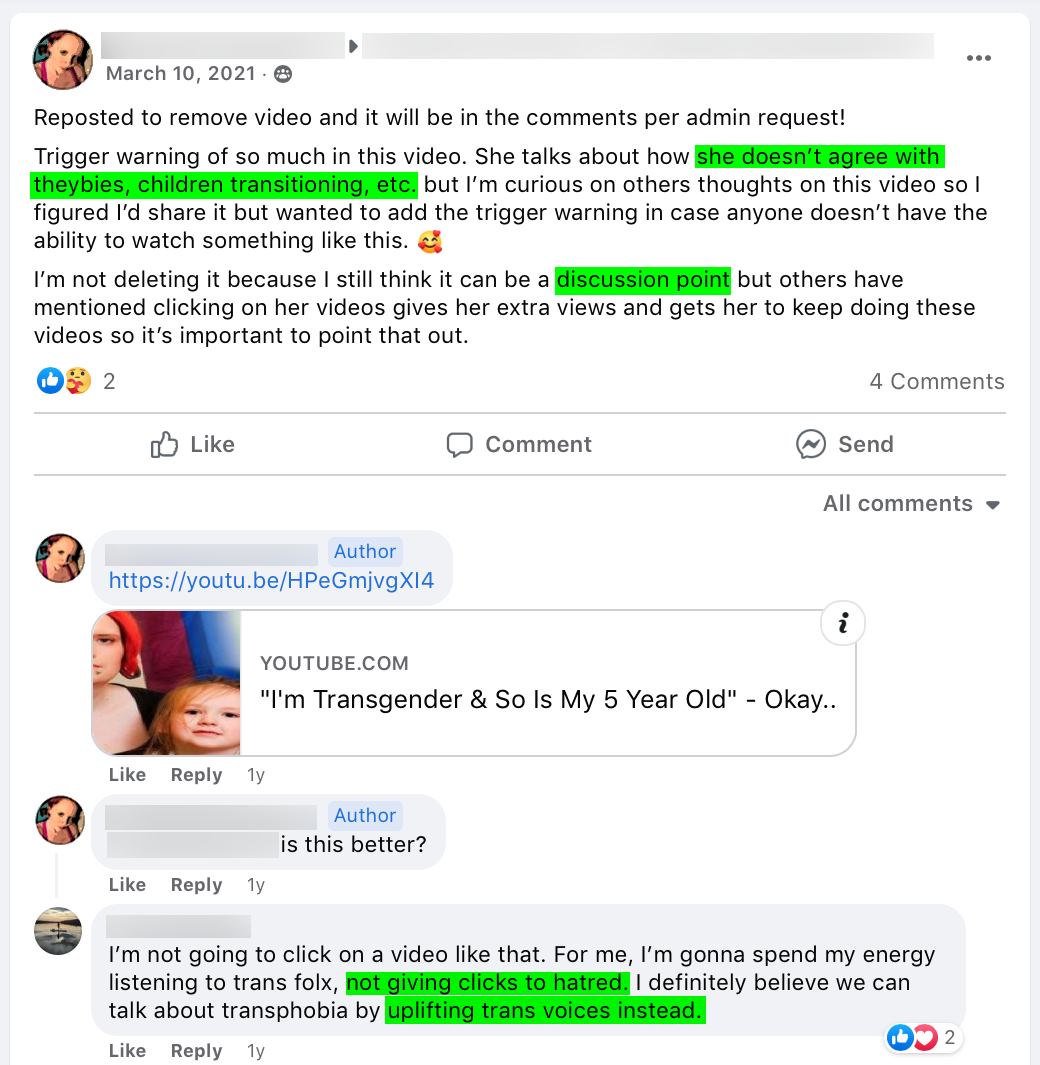 In addition to sharing updates on her children’s gender journeys, she shares other transgender-related content she finds to the group. Interestingly, in a post from March of last year (2021), the mother actually makes an effort to discuss different viewpoints with the group by sharing a YouTube video from Blaire White, a well-known trans woman and critic of modern gender ideology. She points out that Blaire “doesn’t agree with theybies, child transitioning, etc.”