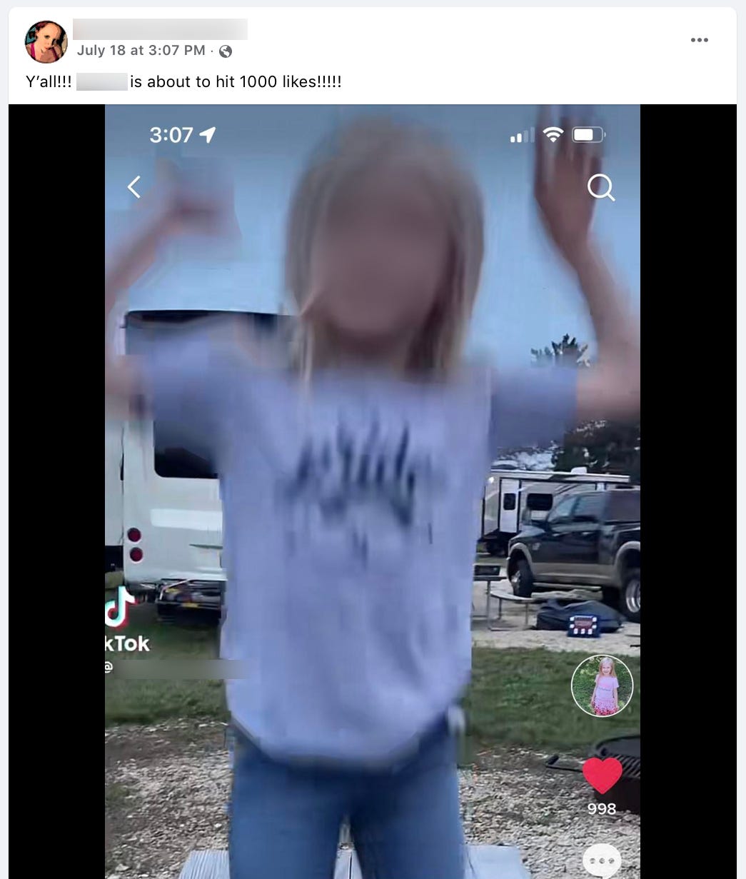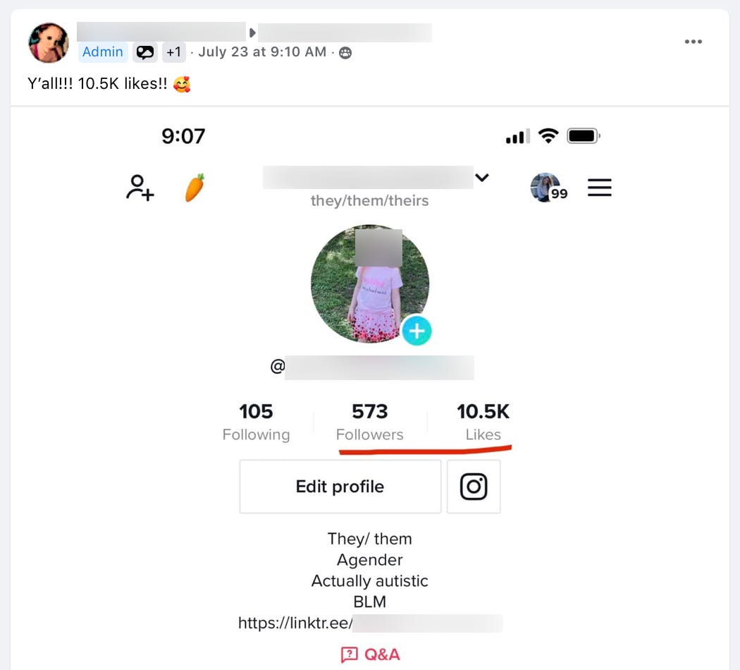 On her personal page, she shares a public post of a screenshot from one of her TikTok videos showing her excitement at reaching “1000 likes.” It seems she may be using her children’s “trans” and “nonbinary” identities for clicks and to bring attention to her business selling social justice themed t-shirts.