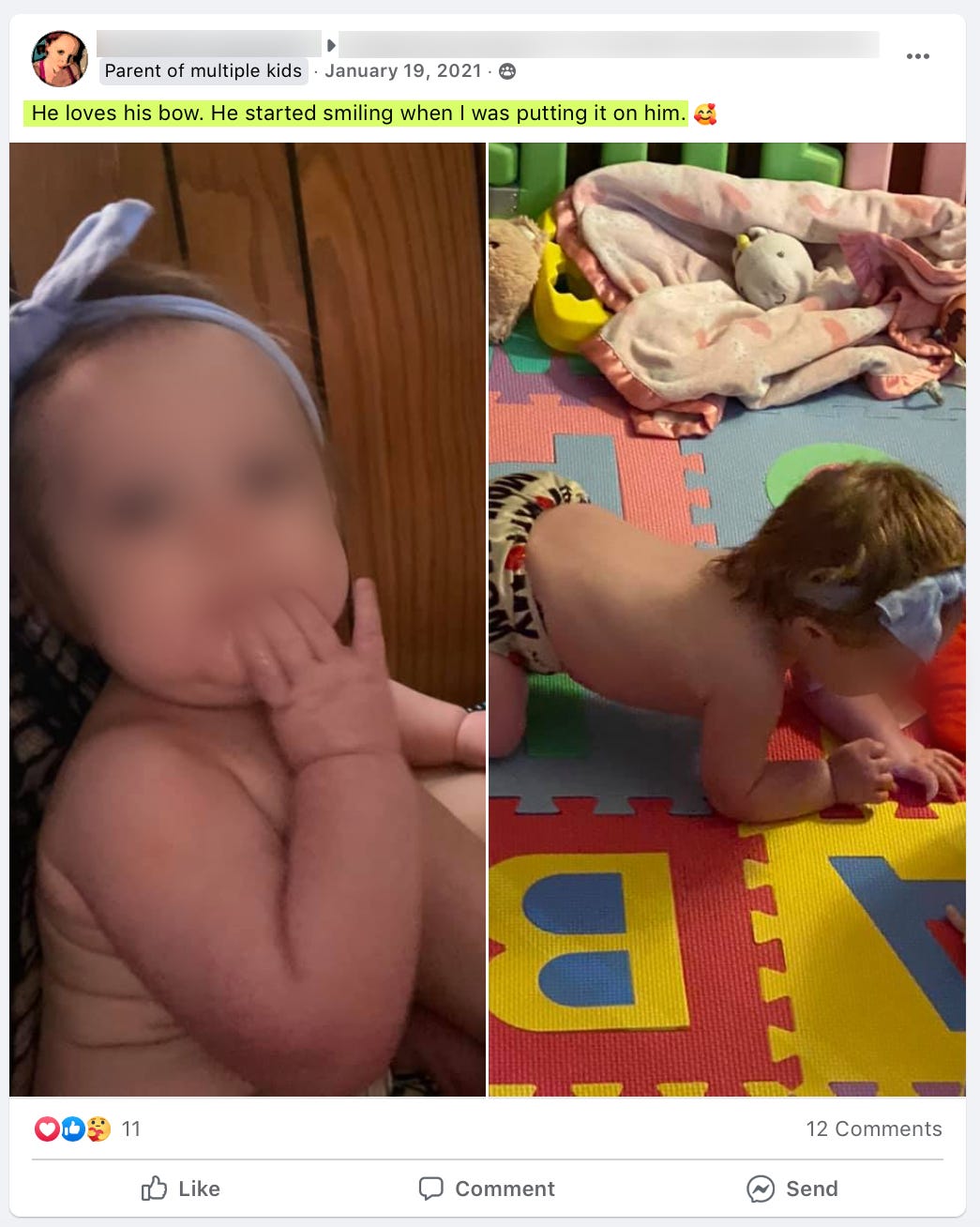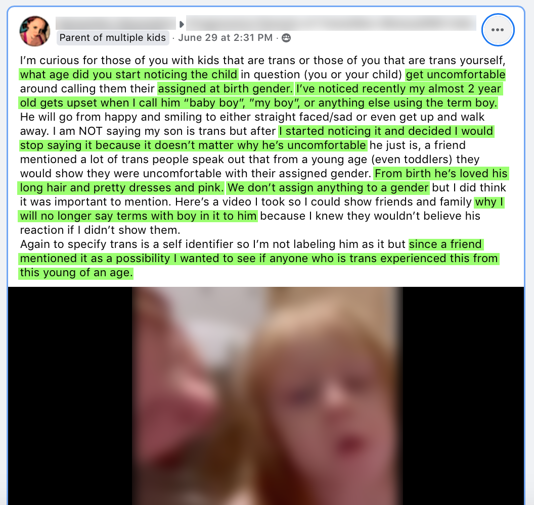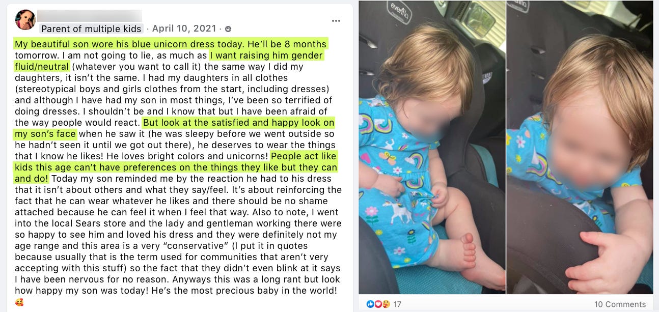 Again, none of this would be that unusual for an infant boy to play with dolls or dress up in a skirt had the mother not been posting about these things in a Facebook group for parents of “transgender kids” with the intent to seek advice and praise from other parents of “trans kids.”