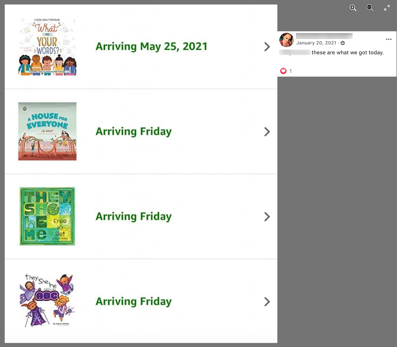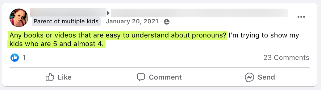 Commenters recommend their favorite transgender children’s books about pronouns, and she buys them all.