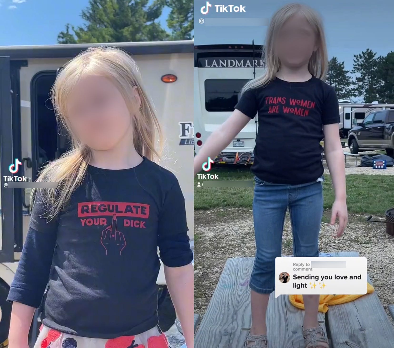 Some of the t-shirts her children model for on TikTok feature statements like “Regulate Your Dick,” and include a woman’s hand giving you the middle finger. Another t-shirt displays the trans activist mantra “trans women are women.”