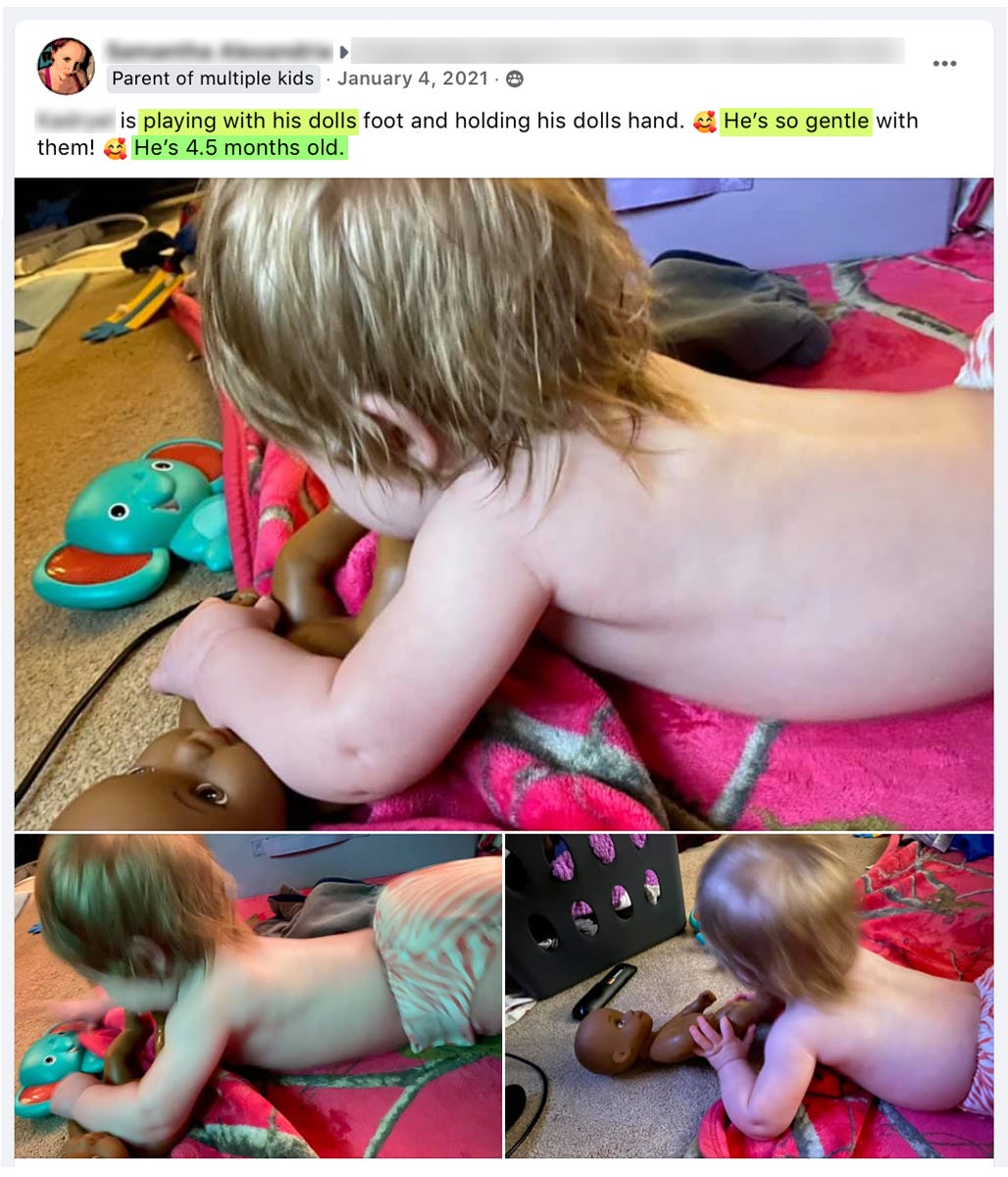 Her first post in the group describes her 4 month old son’s “gentle” play with a soft plastic toy baby doll.