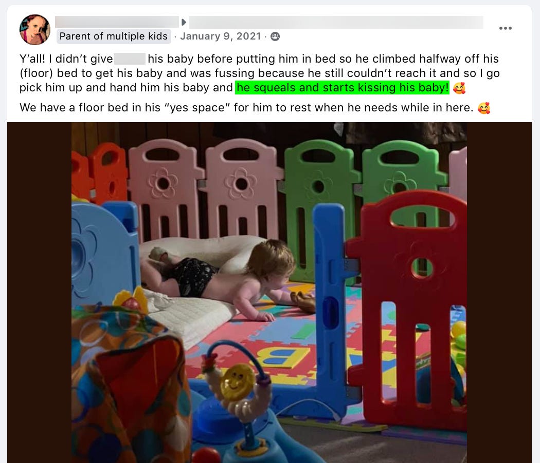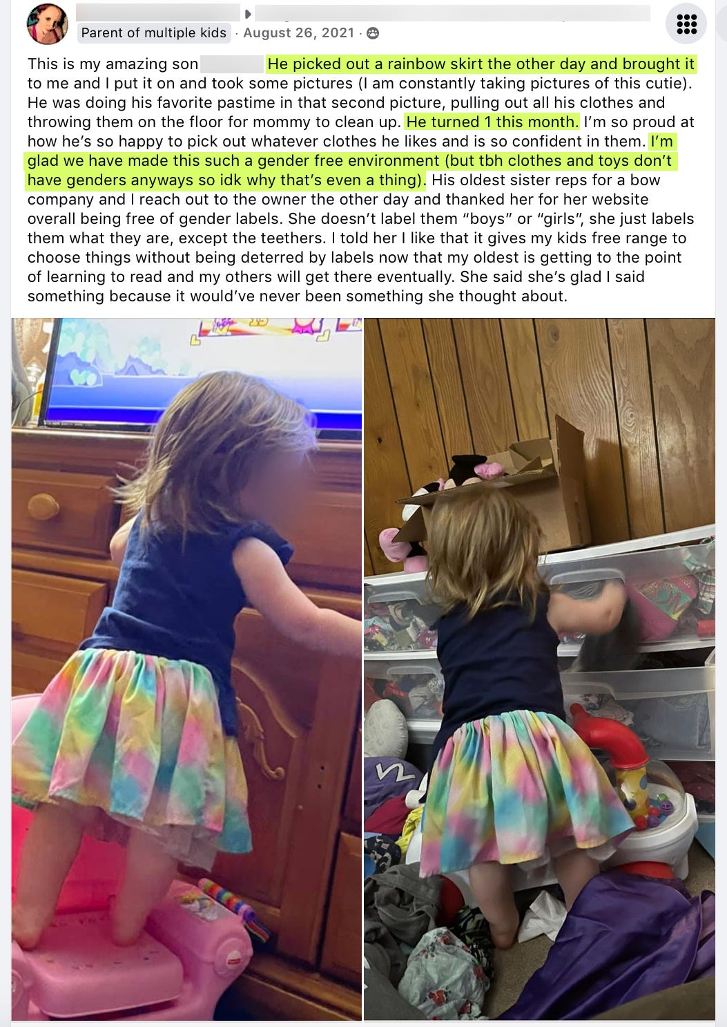 In August 2021, her son is now 1 year old. She shares with the group that her son likes to take clothes out of his drawers and that one day he “picked out a rainbow skirt” that she immediately put on him and took pictures to share with the group. She then explained her parenting philosophy of raising her children in a “gender free environment.”