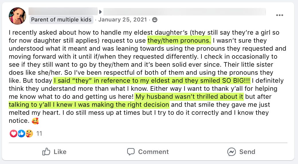 If you’d like to see more reports on my findings in the many private Facebook groups I have access to for "Parents of Trans Kids" and "Trans Teachers," please consider donating or becoming a paid subscriber. I am completely independent and can only continue my journalistic endeavors with your support.
