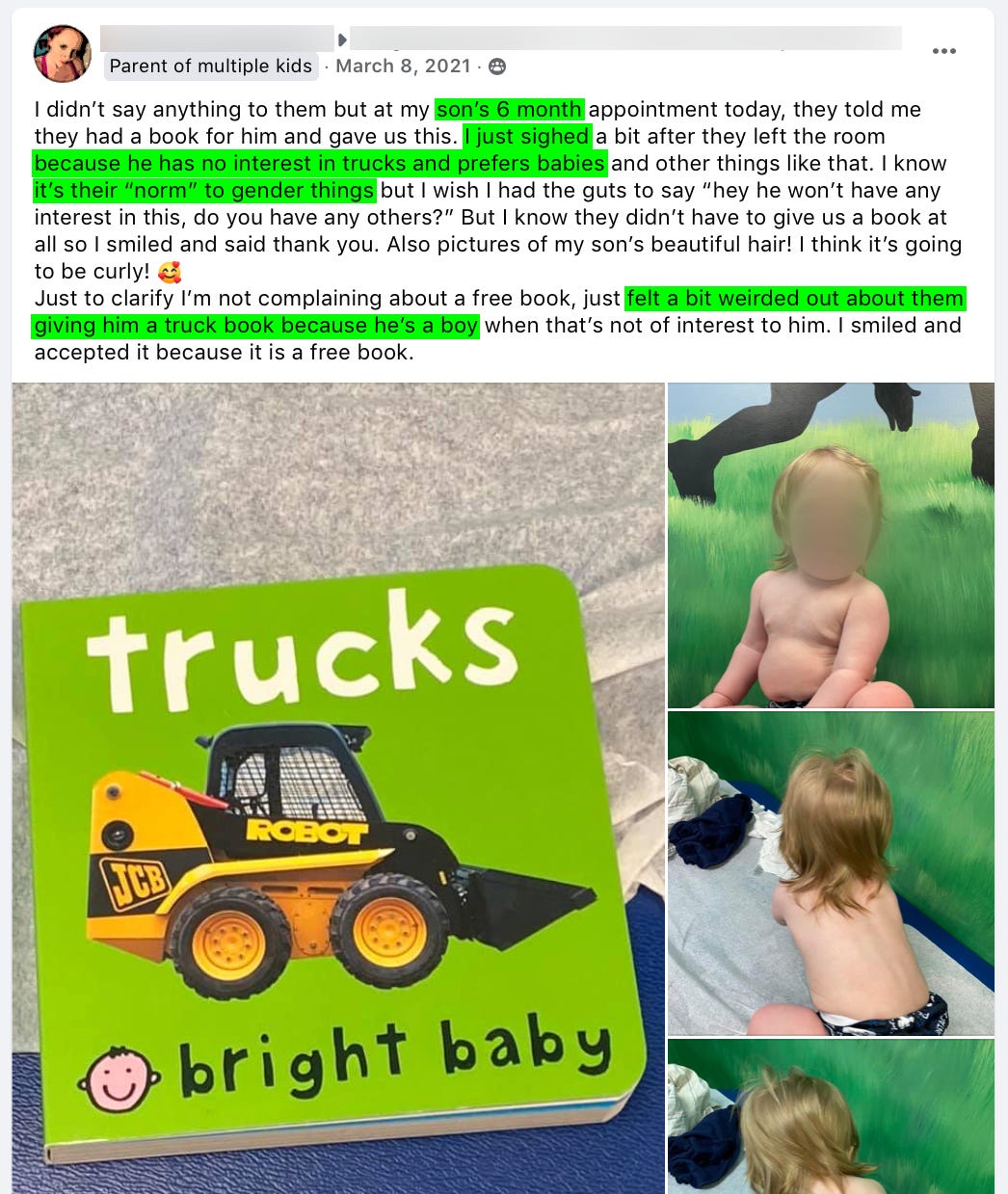 The mother then shared a story about something that happened at her son’s 6-month doctor visit. While in the doctor’s office, her son was given a book about trucks. The mother claims that she “sighed a bit after they left the room” because her son “has no interest in trucks and prefers babies,” and that she “felt a bit weirded out” that someone would simply assume her son would like trucks “because he’s a boy.” She also fishes for compliments on her “son’s beautiful hair!”