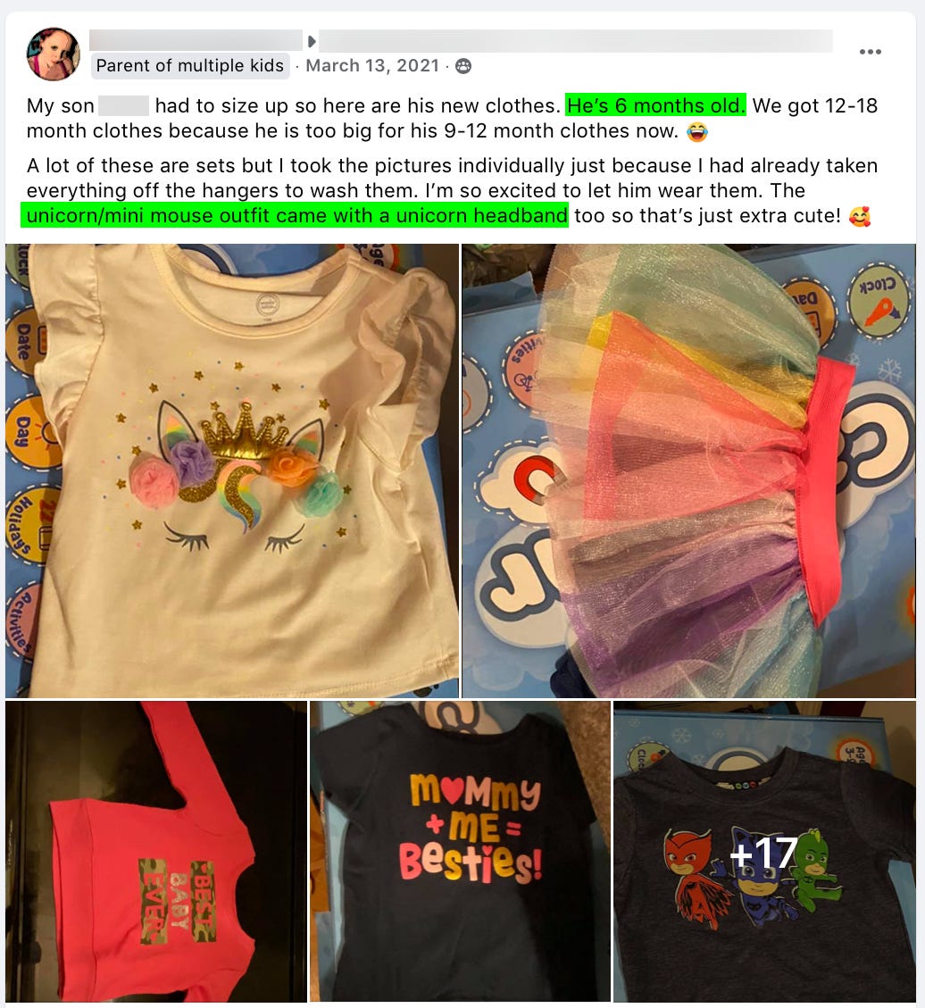 Several days later, she posts 17 photos to the group of a collection of new clothing items she bought from both the boys’ and girls’ sections intended for her son to wear.