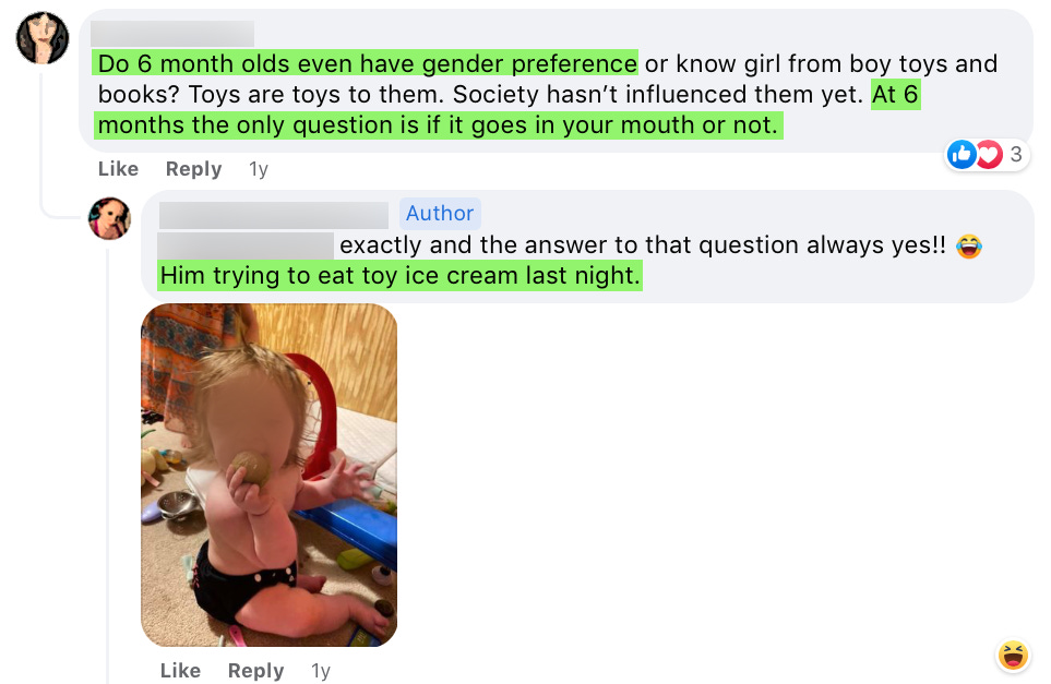 A commenter on her post then questions whether a 6-month-old can even have “gender preferences” in toys, adding that “At 6 months the only question is if it goes in your mouth or not.” The mother then confirms her son’s tendency for putting random toys in his mouth.
